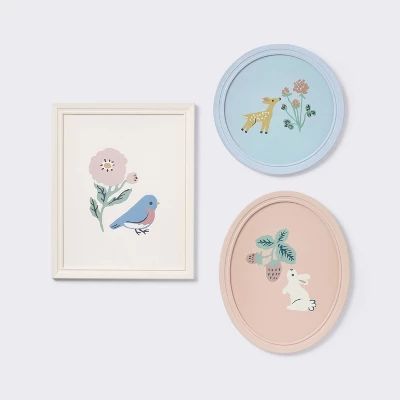 Add a soft, serene touch to your kid’s room with these 3-Pack Wall Decor from Cloud Island™. This pack includes three framed wall art pieces: one rectangular piece in white featuring a sparrow and a flower, one round piece in blue featuring a deer and flowers, and another oval-shaped peach-hued piece featuring a rabbit and strawberries. Made of paper, these framed wall arts boast a sawtooth back for easy hanging. Style them separately or together for an eye-catching display.