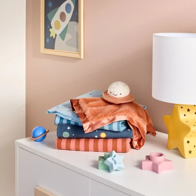 Bring cheery charm to your nursery with these Flannel Baby Blankets from Cloud Island™. This pack includes four square baby blankets, each measuring 30 inches and featuring vibrant stripe or space-themed prints. The set includes one blanket with blue stripes, one with peach and brown stripes, one light blue blanket with blue stars, and one with a vibrant space print on a dark background — adding a delightful touch of style to your little one’s snuggle sessions.